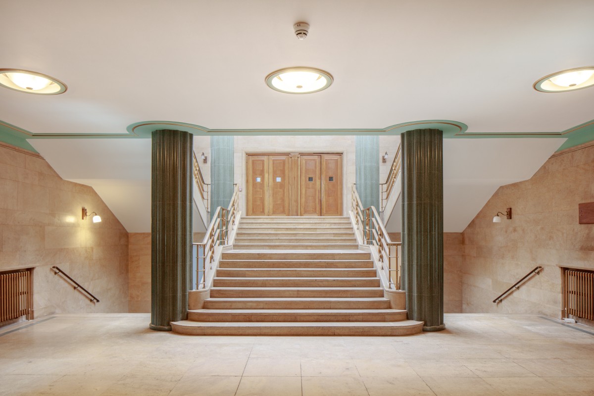 Restoration of some of the outstanding original design features included four giant fluted concrete columns** clad in green marble, restoration to the original terrazzo floor, and to stone architrave and fireplaces. New modern finishes were seamlessly integrated with the existing features to create a modern, yet characterful working environment.