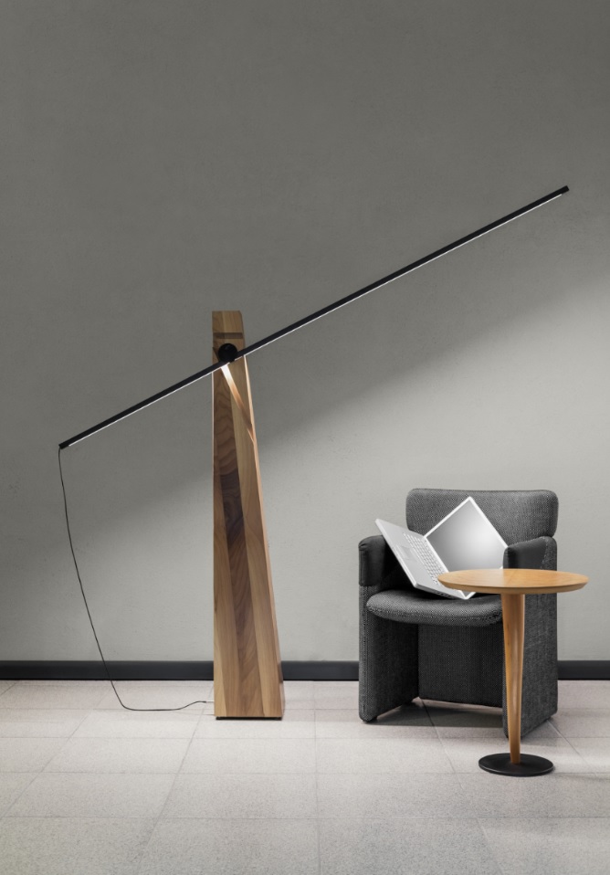 Floor lamp with double LED light sources, Solid oak or walnut base with a black anodized arm housing the LED light source. Three machined grooves in the main body allow the light source to be placed in up 12 positions, with a further set of LEDs in the back of the main body.