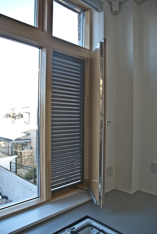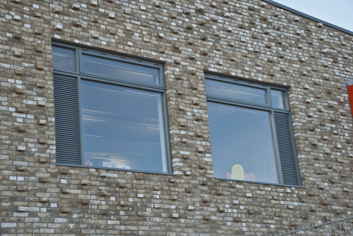 Louvres have been used to help increase ventilation to the various rooms throughout the hotter, summer months. The external louvre is colour matched identically to the aluminium frames (RAL 7037, Dusty Grey) and has a built in fly screen. Internally a solid timber panel has been used, which is finished to the same specifications as the timber frames (clear lacquer on Pine). This inward opening panel has a circumferential gasket which ensures that in the winter there is no cool draught allowed through the louvre, keeping the thermal aspects of the window at a high level. The use of louvres also makes a good area for teachers to put up various displays!
