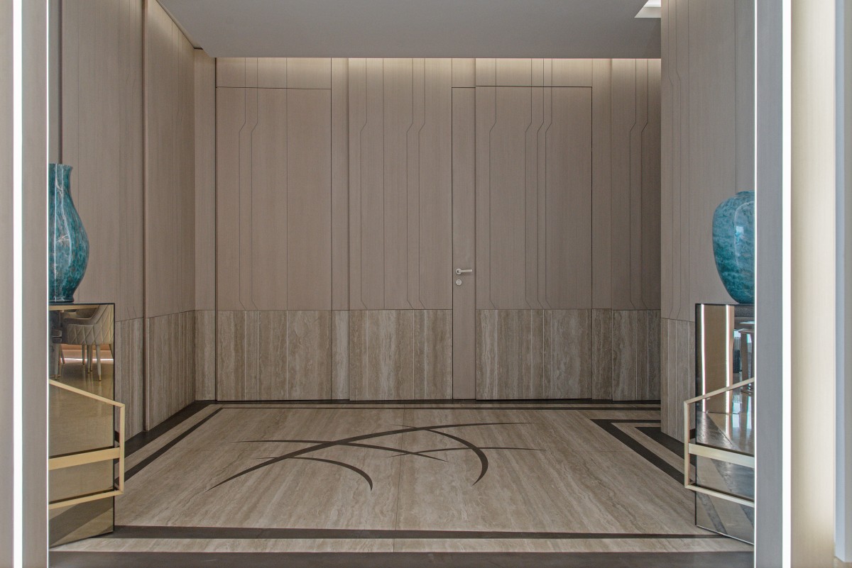 The indoor hallway area is a gateway to the rest of the apartment, where doors leading to the various sections of the house blend together, creating a vertical shutter effect with unified lines, joints, veneer, and ceramics for the whole area. The hidden wall panels feature grooves in stylized shape that extend all the way down to their ceramic bottoms. The floor, paved with the same ceramics as the doors, boast inlaid bronze shapes with a similarly treated frame, while a lighted opening leads to the open living space.