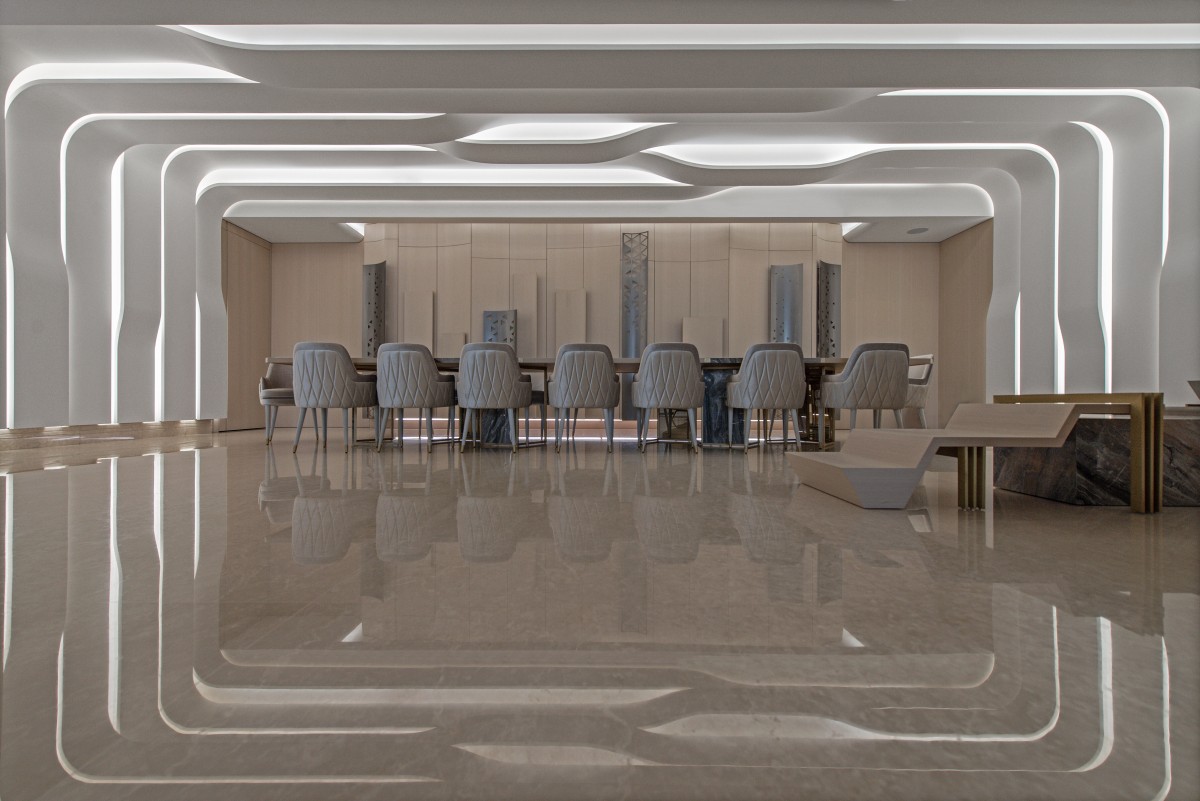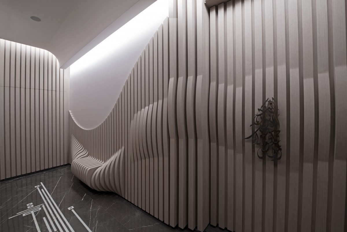 The dining table can serve up to sixteen people, with a second tailor-made curved dining unit. This one of a kind wall installation brings form and function to the space, adding beauty and style while serving as a storage unit. Each of its shutters was molded individually and includes aluminum laser cut handles with geometrical patterns. The embedded lighting allows the unit to shine. In this section, the walls are riddled with uneven wavy stripes that reach all the way up to the ceiling, the opposite wall, and end by the floor.