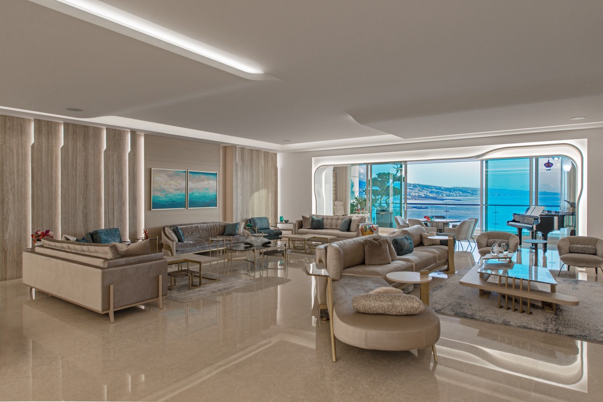 The Casa K residential project was implemented with Wael Farran Studio’s passion for design, attention to detail, and its signature touch of love. Inspired by the movement of the sea, variations of stylized curvy lines guide you through the apartment’s personalized spaces in monochromatic tones, building up the warm, safe, and comfortable feeling of a happy home. Situated along the “Beiruty” coast, the apartment boasts a private elevator area, an entrance lobby that leads to an open space saloon with a living area, a dining space, four bedrooms suites, including a master bedroom with a dressing area, a study and work room, a guest bathroom, two kitchens, and a help chamber.