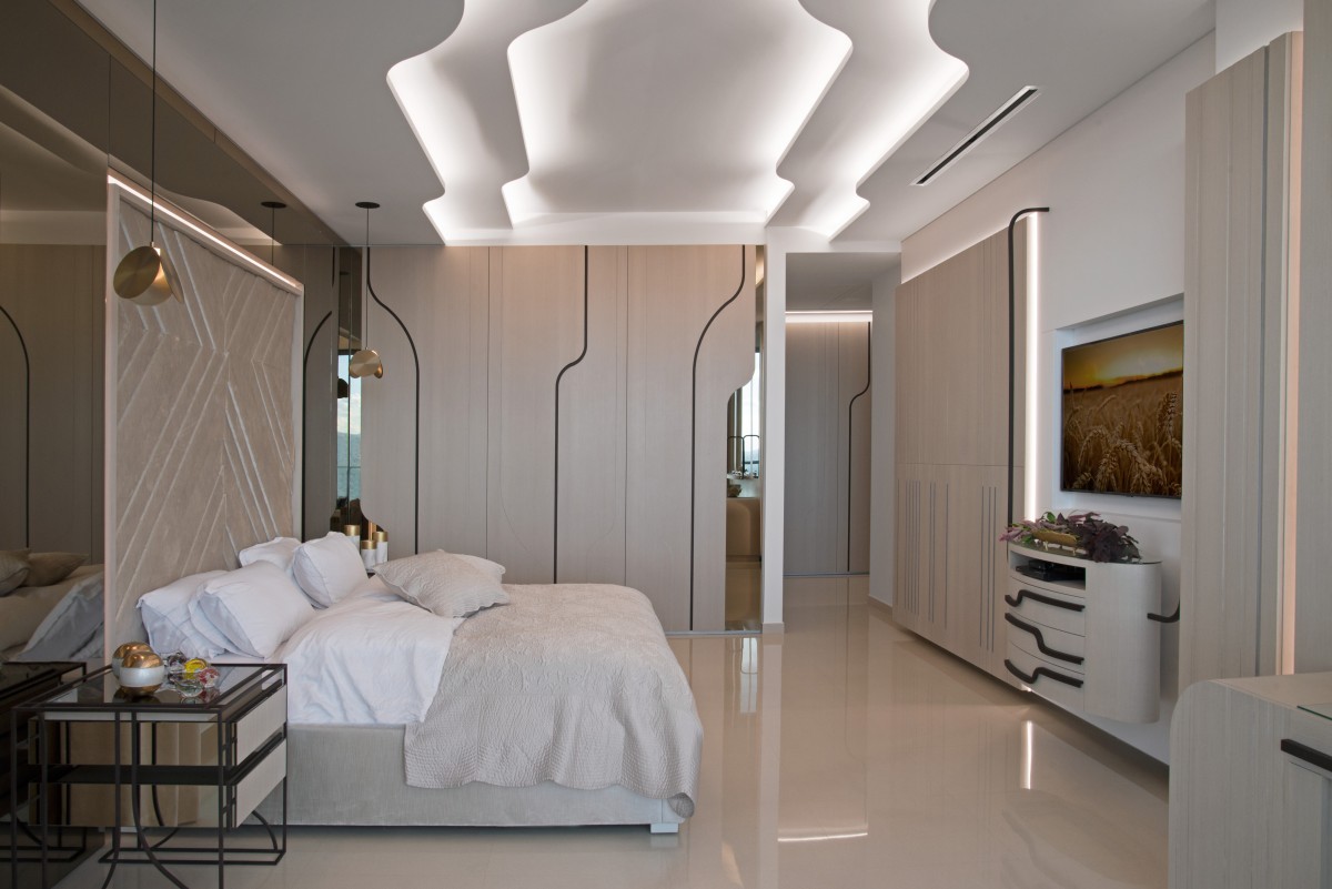 Last but not least, the master bedroom greets you with clear lines and soothing emotions as you enter the ton sur ton space. You first step into the dressing room with closets from end to end. The closets are made of Caleidolegno MW Toglio wood veneer, supplied from Tabu Italy, and feature hidden handles and bronze mirrors. Both joints and handles, made of oxidized steel, follow a unique path that goes all through the room. The TV unit facing the bed hangs from the ceiling and holds drawers and storage spaces. Further down the line, is a dressing table with a tryptic of mirrors, with the side mirrors that double as storage. The bed features a customized velvet head board, made and installed in individual pieces to create a trompe l’oeil effect, while the rest of the wall is covered in bronzed mirrors. Paired, a set of two night tables by Formitable©, grace the side of the bed. Curtains made of velvet panels and sheer material open to breathtaking views of the sea and, if you look up to the ceiling, you are reminded of the lines that run all around the room. Bespoke lighting by Masiero Lighting adds brightness to complete the look.