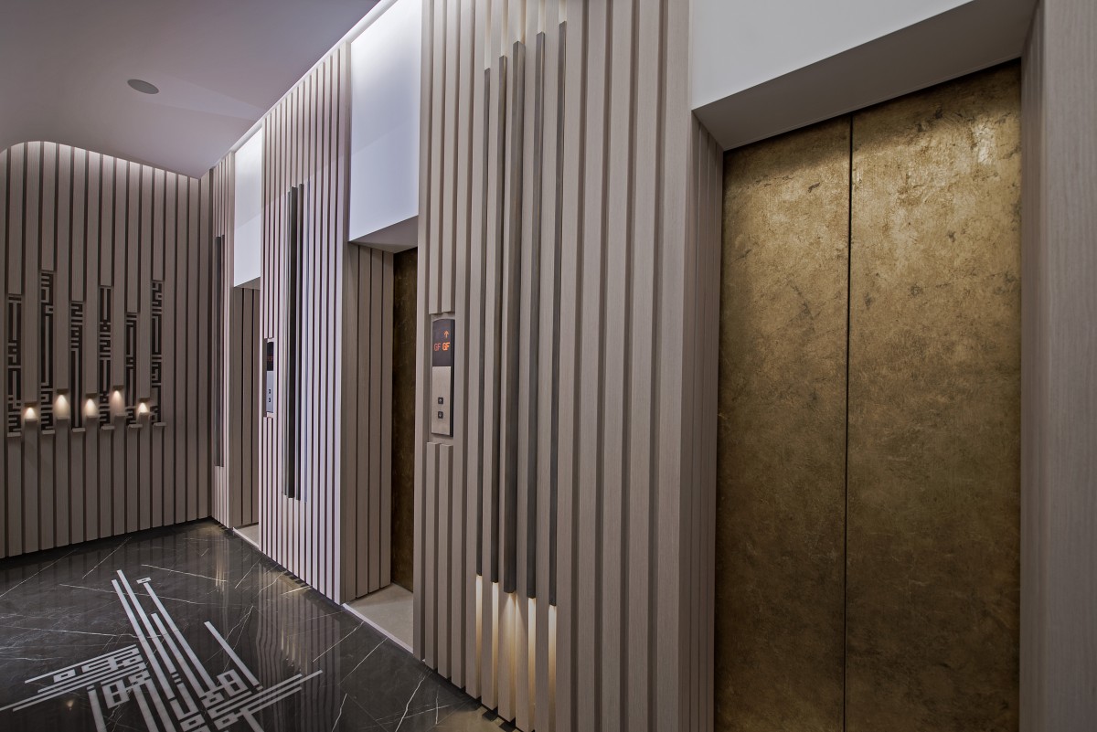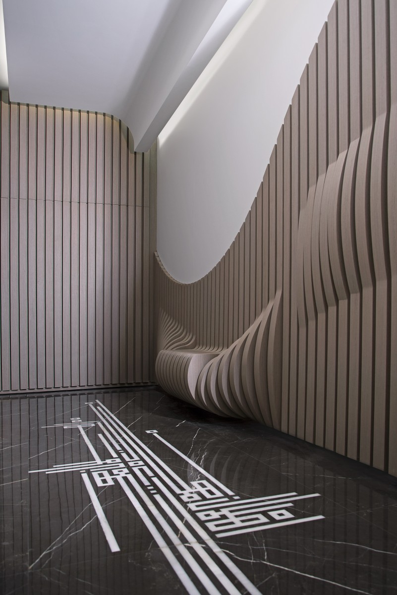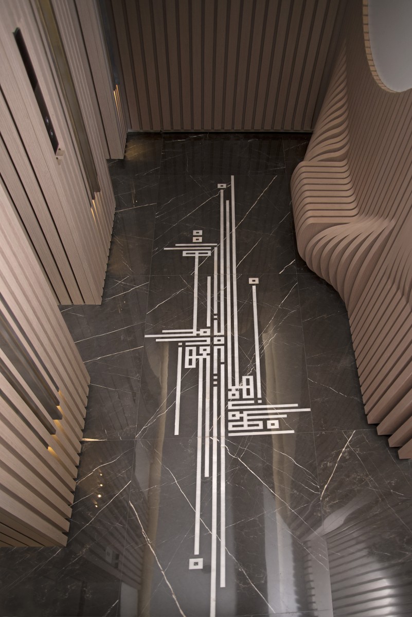To the right, Arabic-blessed sayings, molded in copper, fit between the wooden stripes. The wooden stripes, rising from the floor, stop their elevation under the writing and pop out in a curve to create a beautiful leveled movement, enhanced with lighting. The three elevators doors are treated with gold leaf paper and patina. Between the elevators, light shines from the extremities of protruding brass stripes. The floor, made of graphite brown and “pantelique” white marble, features square kufi style work by Ghaleb Hawila. The bright white ceiling extends in a straight movement from the elevator and curves at the other end in harmony with the general mood.