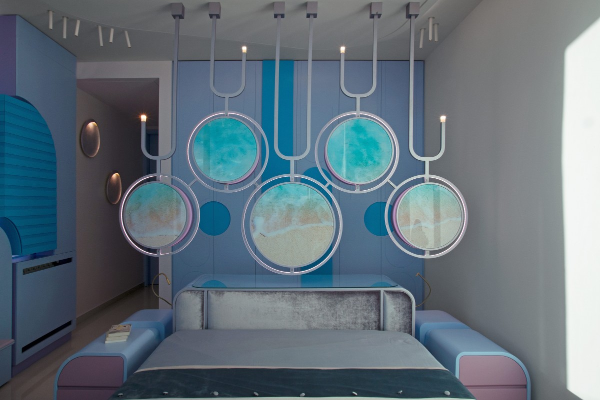 For the second daughter at Casa K, it’s all about the rhythm and colors of the sea. It begins with a custom-made bed facing the sea, with a suspended installation from the ceiling serving as a headboard and doubling as a dressing unit. The round units, covered with images of the seashore on the bed side and with mirrors on the dressing side, serve as hidden storage. The night tables also extend to the dressing side to provide extra storage space. The closet features stylized curved shapes, while the shelving unit boasts hidden cabinets and an extended bench for study time, all in beautiful pastel shades. Lighting fixtures, including Model Lake from Foscarini added to the walls, and Juncos from Flos Kap White fixed on the ceiling, illuminate the room. Continuing with the same coastal theme, the bathroom wall greets you with a beautiful photo, printed on a glass wall, of people enjoying the deep blue sea, courtesy of photographer Maya Fardoun. The sink unit, fully custom made in shades of blue, is a reminder of sea pebbles.