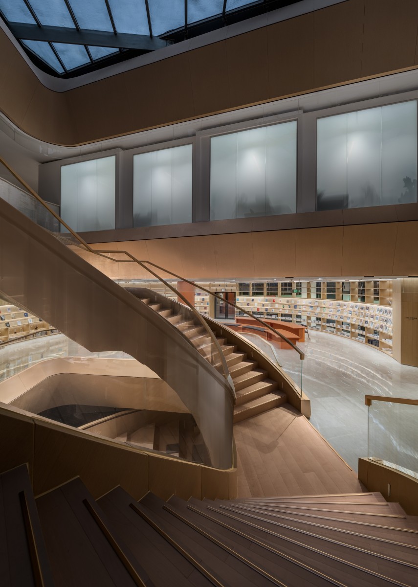 The staircase is connected to the circular walkway on each floor, which in turn connects to the “inner construction” box body, forming a continuous indoor vein. The building has a multi-faceted orientation from southeast to northwest, surrounded by transparent curtain walls. Functional spaces are located next to the windows and facing the atrium from outside to inside. Natural light is introduced into the rooms through surrounding curtain walls and skylights, creating an open and inviting atmosphere with rich texture for the book bar.
