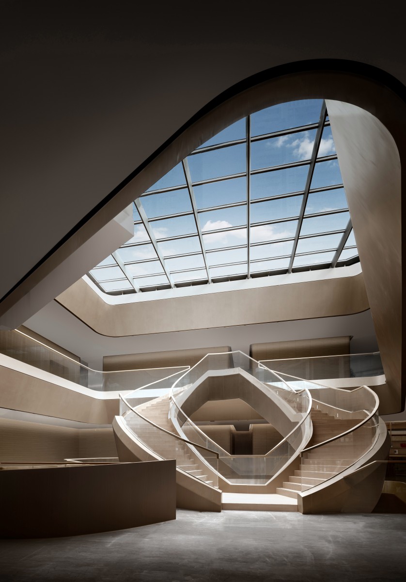 The “ring double” running ladder, the “conch” shaped road show ladder, and the “spring” rotating ladder connecting the underground layer are strategically positioned in the open atrium. The curves of the stairs create a captivating display under the flowing light and shadow on the projector surface of the large glass zenith, evoking a strong sense of curiosity for exploring the unknown world.