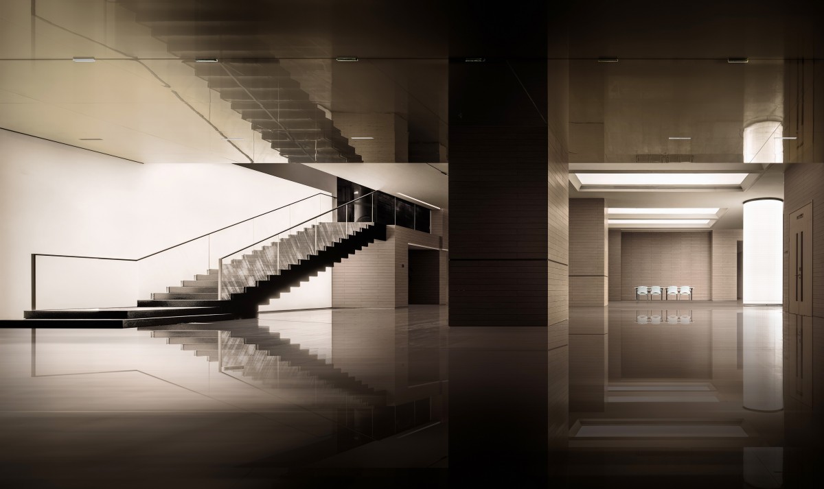 The minimalist corridor uses surface light sources and mixed granular ceramic panel wall surfaces along geometric stacked straight stairs to create a calm space that expresses minimalism, combined with modern aesthetics.