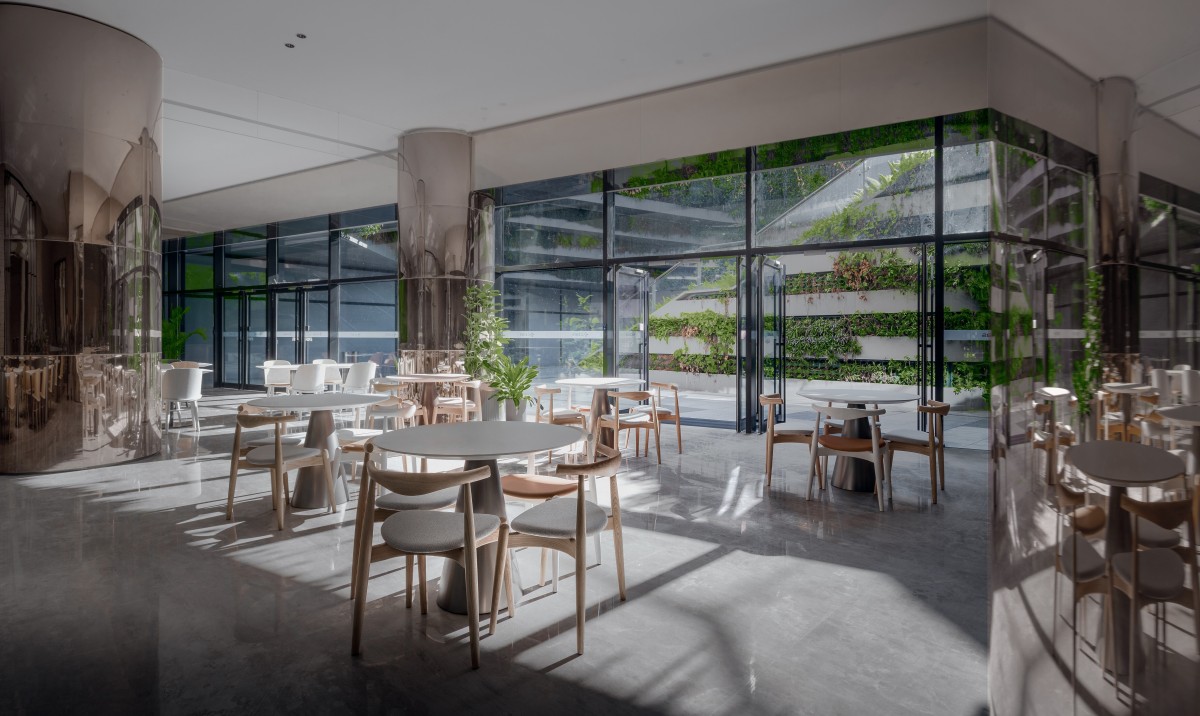 The entire dining area is designed with openness and accessibility in mind, responding to natural light and views created by outdoor vertical vegetation. Reflective ceilings and columns encourage harmony between humans and nature.