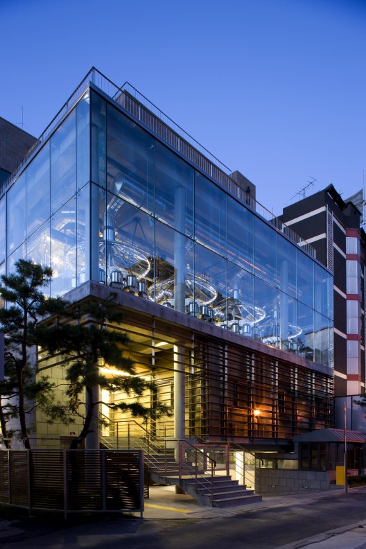 The Choonwondang Oriental Clinic & Museum is a mixed-use building, as the name suggests. The functional programming is based on the Essence-Energy-Spirit Theory of Oriental medicine. Doctors’ offices and a herbal-medicine production room seek to enliven the essence of the body; the basement hall, where various cultural activities such as exhibitions, seminars, and concerts take place, is intended to enhance the energy of the mind; the museum, where the history of the clinic itself and traditional relics of Oriental medicine are on display, promotes the spirit of the medical profession. Located at various parts of the building, these spaces are open to visitors and well connected with the surroundings. Materials are also based on the philosophy of Oriental medicine. The use of paint, for example, is kept to a minimum. Instead, raw materials such as basalt, exposed concrete with the texture of wood, wood itself, and glass are the main finishing elements; matte stainless steel and galvanized steel are also used. By using natural materials we wanted to show our respect for the philosophy of natural herbal medicine.