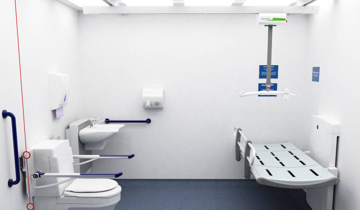 Installation of an adult-sized changing bench and hoist into a wheelchair-accessible toilet helps ensure more inclusive compliance. And, often, no extra space is required: a wall-mounted changing bench will fold flush against away, and the hoist is ceiling mounted.