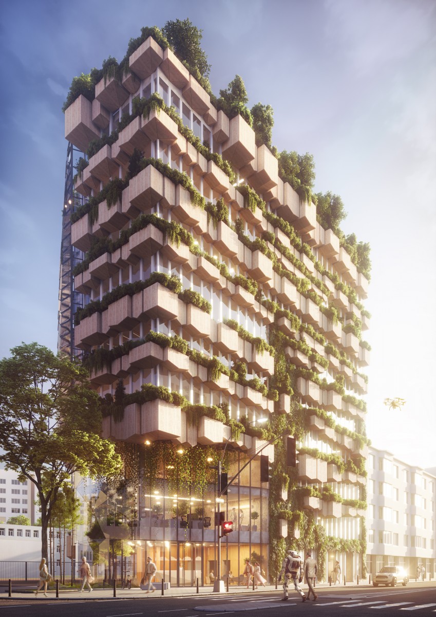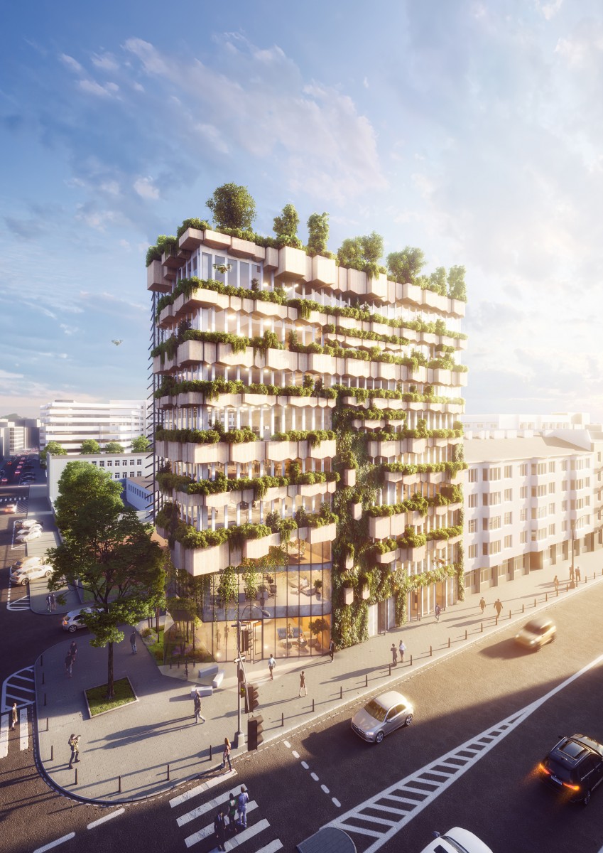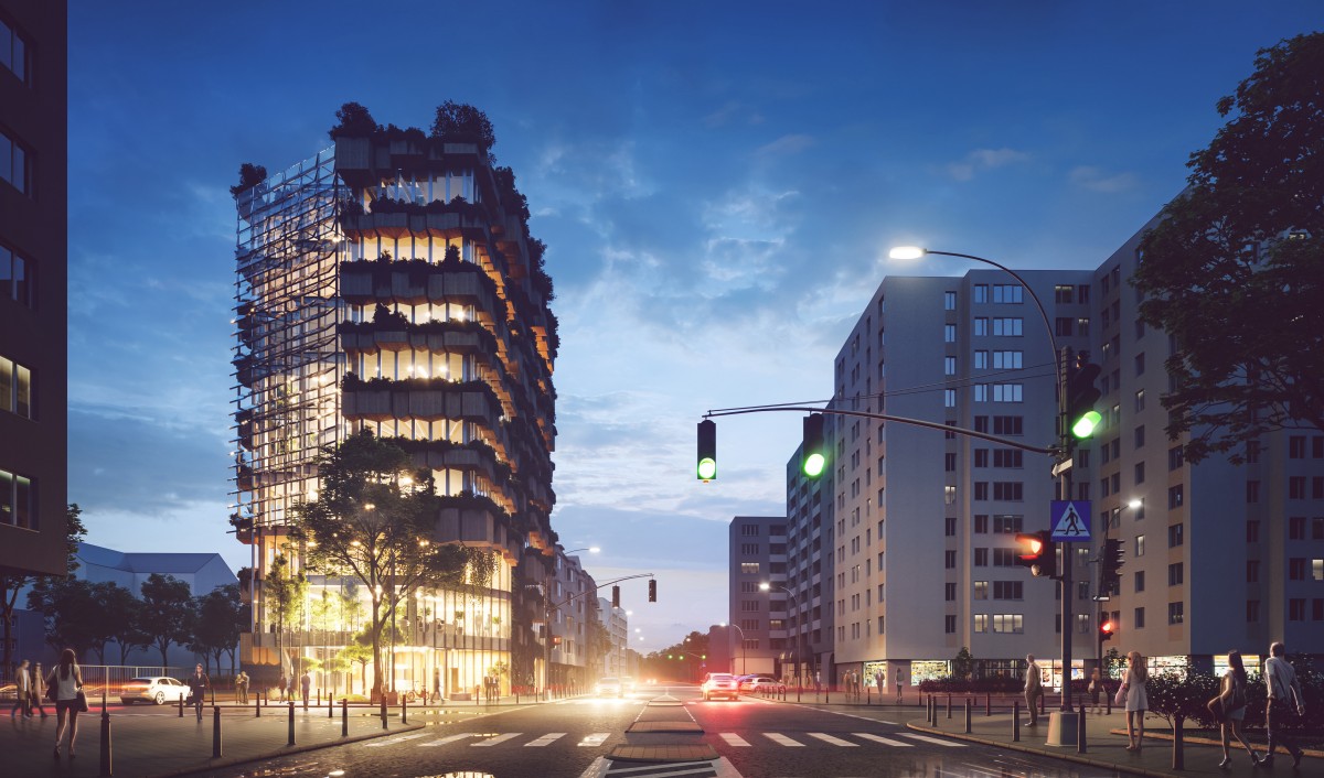 In the area where the building is located, due to the dense development, there is no space for a public square or park. Accordingly, the building introduces greenery into the urban space in an innovative way. A vertical garden and a vertical park are planned on the facades of the facility. A green repository is also planned to be built as part of a vertical park in which plants are placed in prefabricated pots made of laminated wood. The park will provide optimal vegetation conditions for native Polish endangered and rare species. In the case of the vertical garden, the installation of a system based on prefabricated panels filled with substrate is planned. It is intended for low plants, resistant to various weather conditions, including evergreen and seasonally flowering plants.