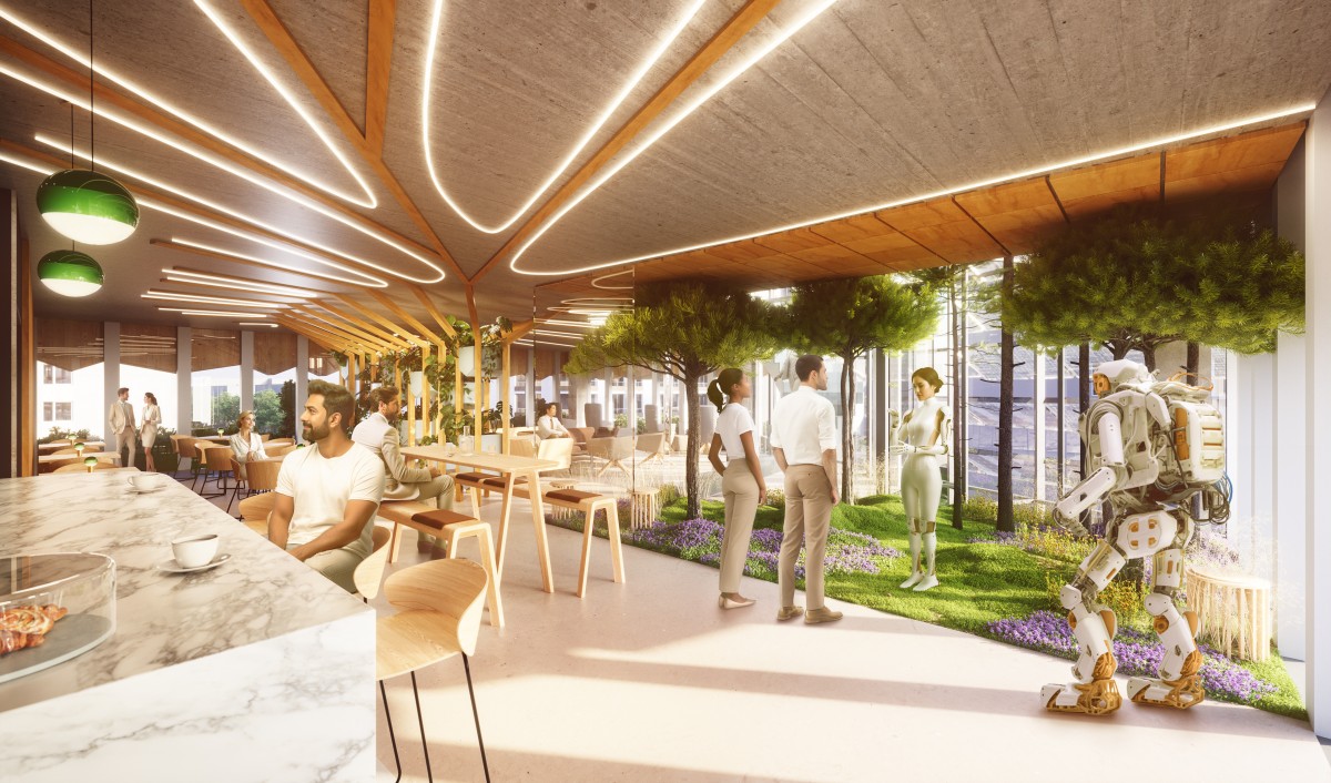 According to current scientific research, the opportunity to experience greenery has a positive impact on people’s mental health. A reduction in stress levels and a lower risk of depression and anxiety have been reported. At the same time, an increase in work efficiency and acceptance of the workplace itself was found. Taking this into account, the building will include two internal green areas. The first one, located on the ground floor, opens onto the entrance hall. The second one, located on the 4th floor, opens onto the Creativity Space and the internal café. It is assumed that the green areas, named “Polish Grove”, will use native plant species that produce phytoncides, i.e. compounds with bactericidal and anti-inflammatory properties.