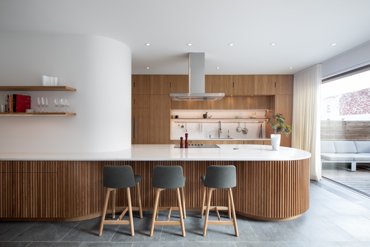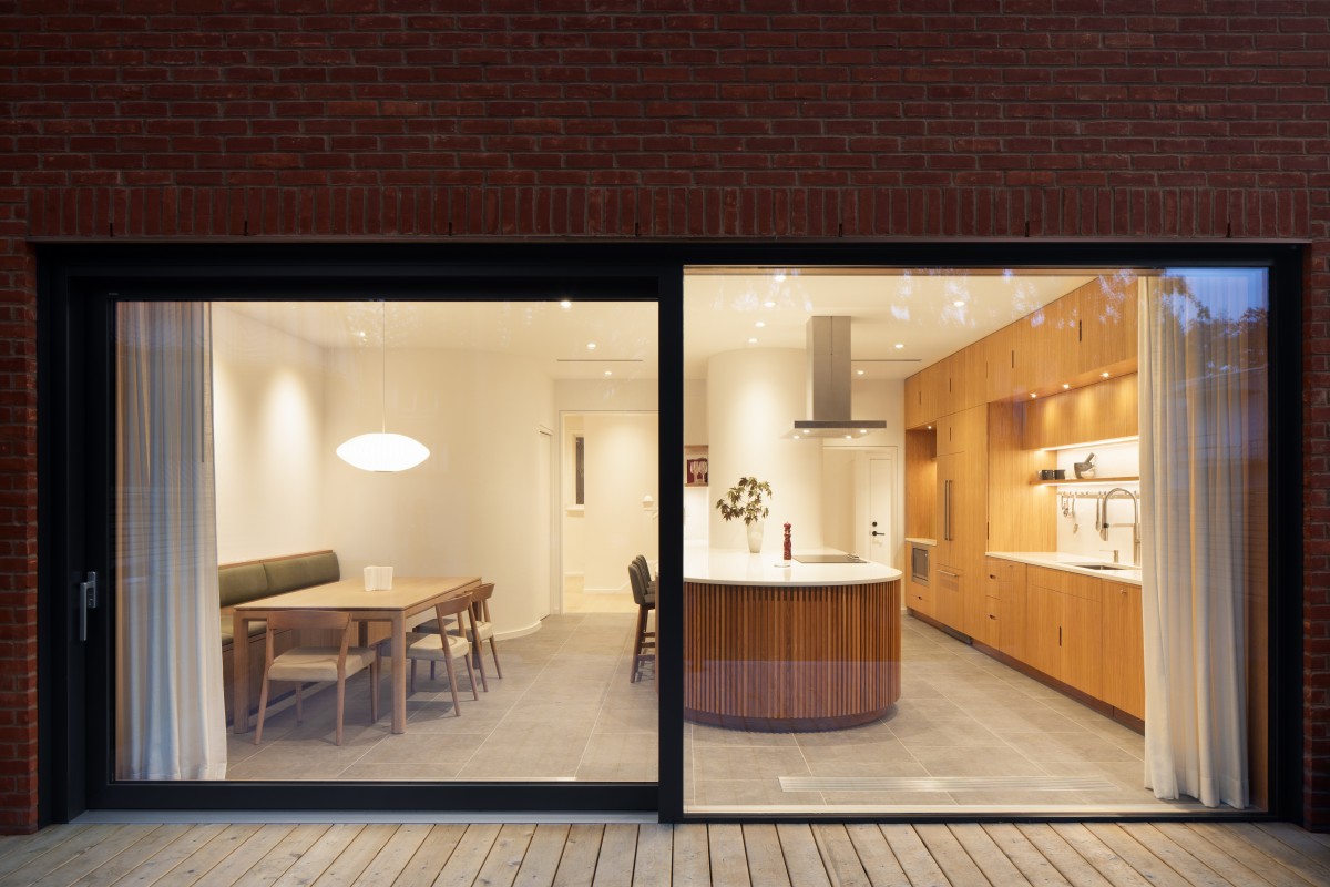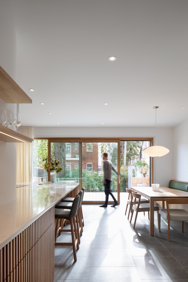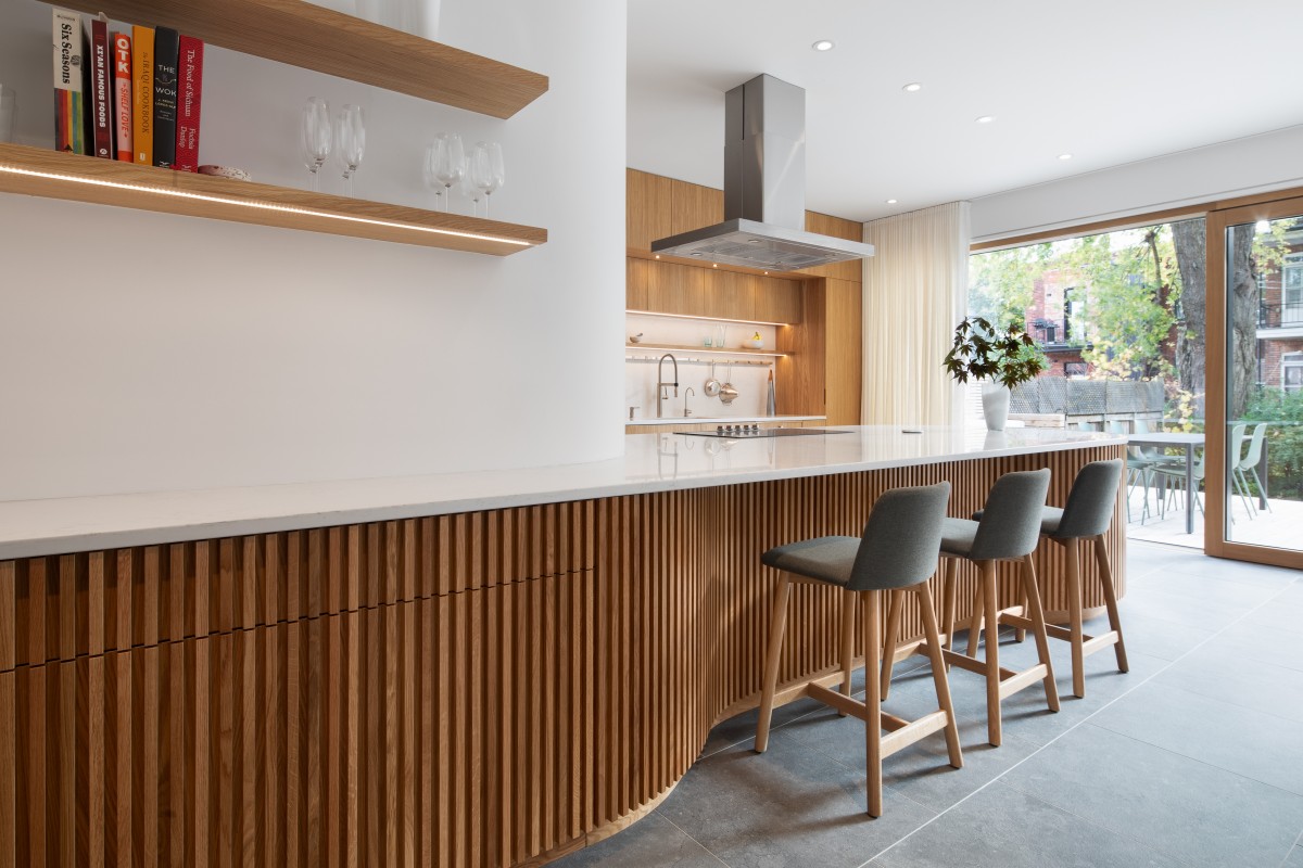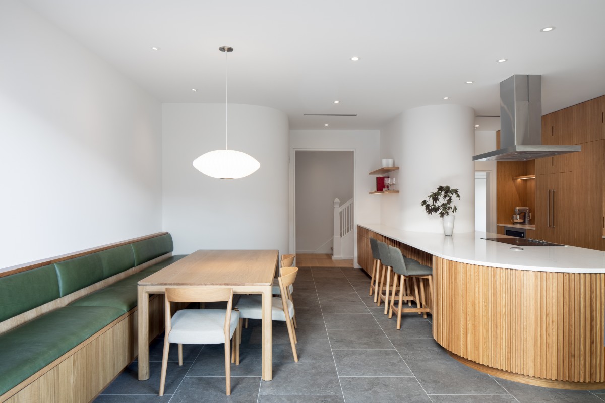 Organizing the kitchen is a central island anchored by an enclosed volume concealing a powder room. Both of these are rounded at their ends, softening the architecture and creating a better flow around the space. Extending this visual language, curves abound, and a coat closet was also added with a similar filleted corner that reflects daylight and opens up the adjacent built-in dining area. The sinuous lines continue under the stone island counter, which is meticulously detailed with white oak slats that flow gracefully around the recess that permits leg room for stools. Storage cabinets and drawers are also concealed behind the slats.