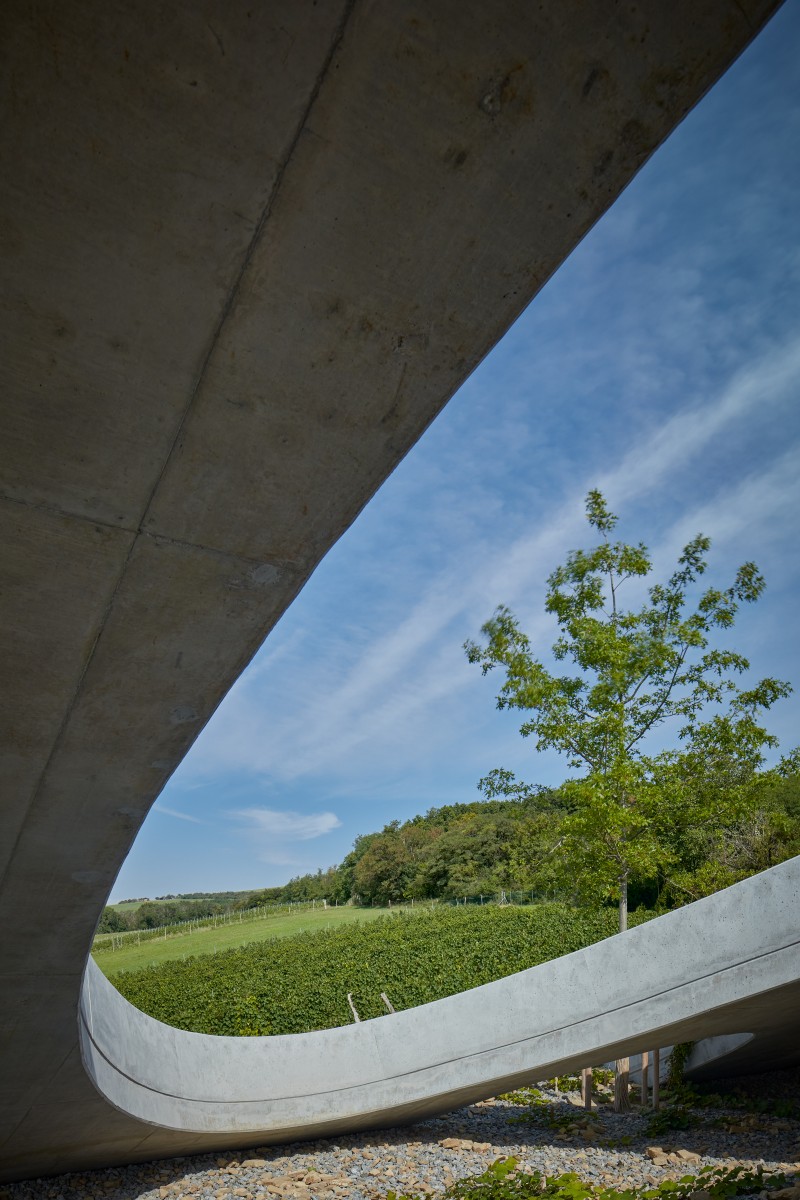 The initial ideas for the wine house considered the most operationally efficient location, literally in the centre of the vineyards. This is both purposeful and poetic, as it steps back from the village and offers soothing and enchanting views. To do so, the building’s location in the open countryside naturally brought with it high demands for architectural and landscape integration. The landscape context is addressed in the form of a gentle curve – a wave in the landscape, a hill between hills. Great care has been taken to incorporate the building into the terrain and its connection to the cultural and natural greenery. The roof of the curve is designed as an extensive green, and the surrounding area of the building has been planted with 150 shrubs and mature trees, often growing through the “perforated” roof. The overall impact and benefit of the new greenery on both the landscape and the building will only become apparent as the years go by.