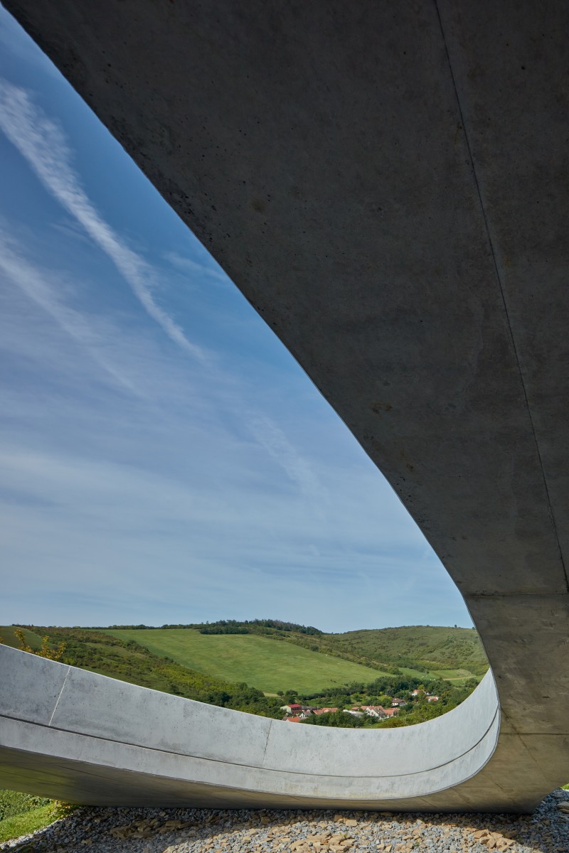 Embedding the building in the terrain creates a feeling of a welcoming background and a natural blending with the place from which the wine comes. The view and airiness can be enjoyed from the terraces and the artificial hill of the green roof, where one can enjoy the fabulous scenery of the horizons of Kurdějov, the Pálava looming in the distance and the plains stretching towards Austria. The spaces of the wine house are changeable and conducive to social, and romantic moments as well as quiet contemplation over a glass of wine.
