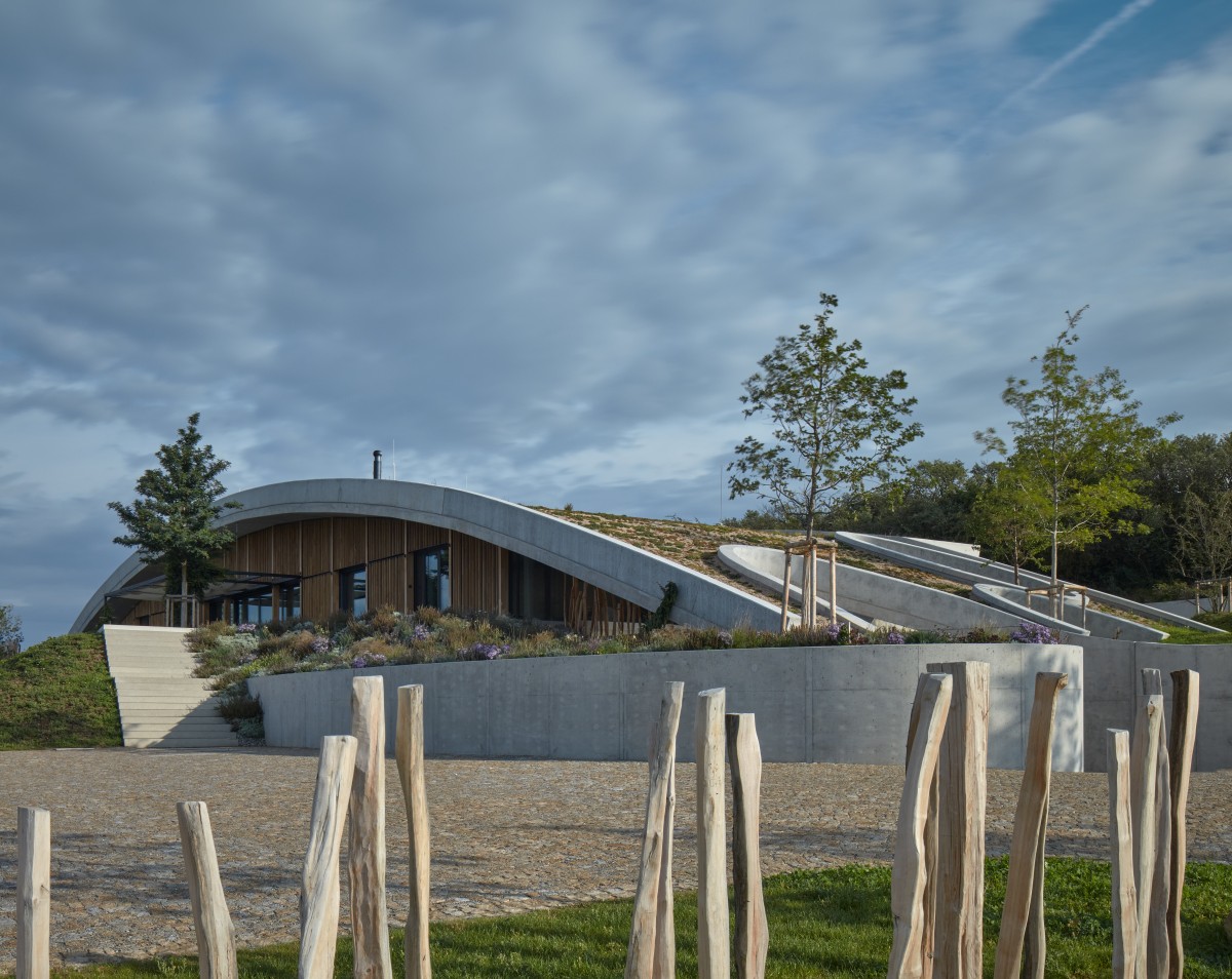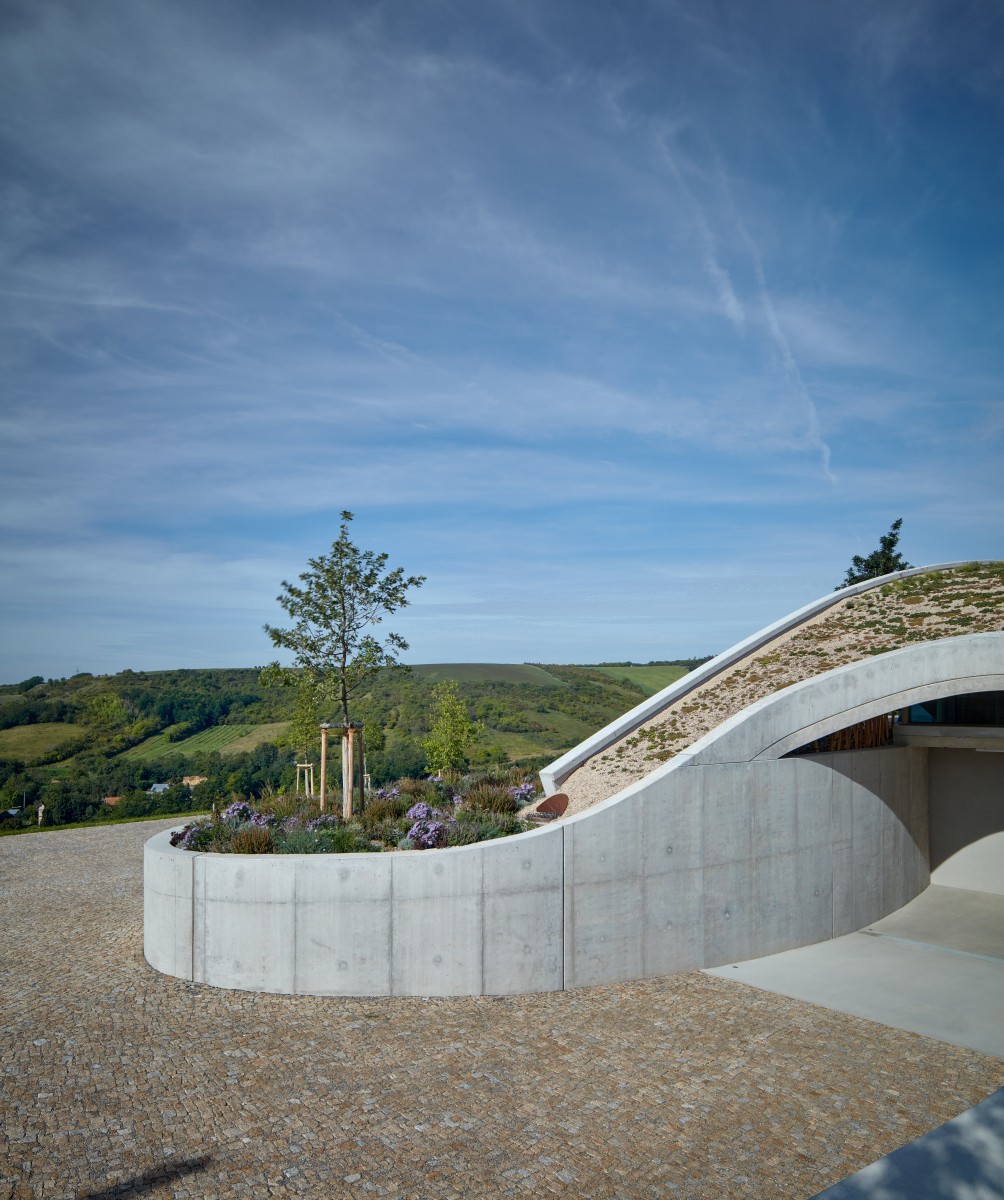 The building is designed with the utmost respect for the surrounding landscape. It is completely covered by a curved extensive green roof so that it is almost invisible in distant views once the vegetation has grown. The surroundings of the building are supplemented with a number of new shrubs and mature trees in order to also create an optimal microclimate in the future. The location of the building right in the vineyard minimizes the transport of raw materials and workers within the winery. The production areas are located under the terrain, while the customer areas are open to the sun through a glass façade, thus making use of passive energy. To prevent overheating in the hottest summer months, thermally insulating triple glazing is designed in combination with wooden oak slats in front of the windows, a sufficient overhang of the curved roof, and shading of the pergola in front of the façade with tarpaulins. An air-to-water heat pump is used for heating. Rainwater is collected in a storage tank and used for irrigation of the vineyard.
