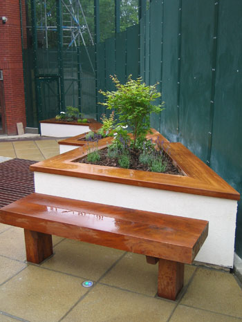 A series of Iroko monoliths were specified to frame flower beds and seating areas in one exterior area of the hospital, while the timber from Howarth was also specified for the raised flower beds and seating areas in a courtyard area of the hospital.