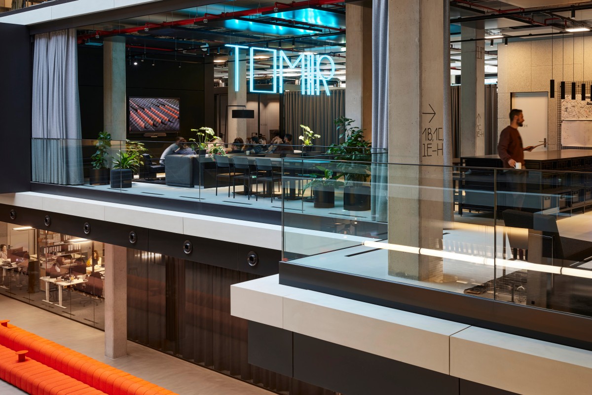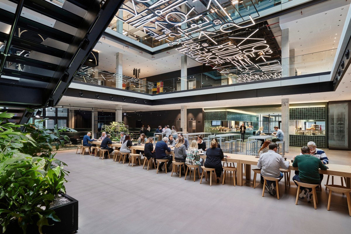 HENN Interior introduced a central axis to connect all three atrium buildings, designed by RKW Architektur+ and KAAN Architecten. The axis and main circulation route, named the Innovation Track, runs throughout the first floor of the entire complex. Visitors enter the Track via a striking six-meter wide staircase at the entrance. The Track’s connective purpose is highlighted by a 130-meter-long light installation, inspired by classic neon signage and designed by Büro Uebele. It also serves as an event and exhibition space: pieces from the private art collection of the company owners are on display, including work by Anselm Kiefer, Georg Baselitz, and Tony Cragg. The building is open to the public and features art tours and space for events.