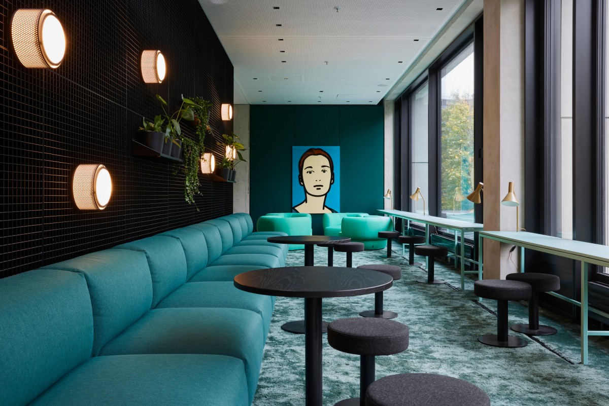 On the office floors, different modes of work – physical and virtual, loud and quiet – can take place in parallel thanks to an acoustic concept that includes sound-absorbing walls, ceiling panels, and heavy felt curtains, as well as the spatial organization of the offices and meeting rooms. The livelier zones are organized around the interior atrium and include spacious tea kitchens and rooms for collaborative work. Around the perimeter, HENN Interior placed quieter areas for focussed work, including telephone boxes and meeting rooms that serve the individual agencies.