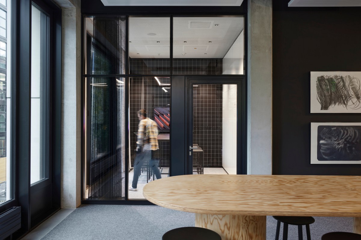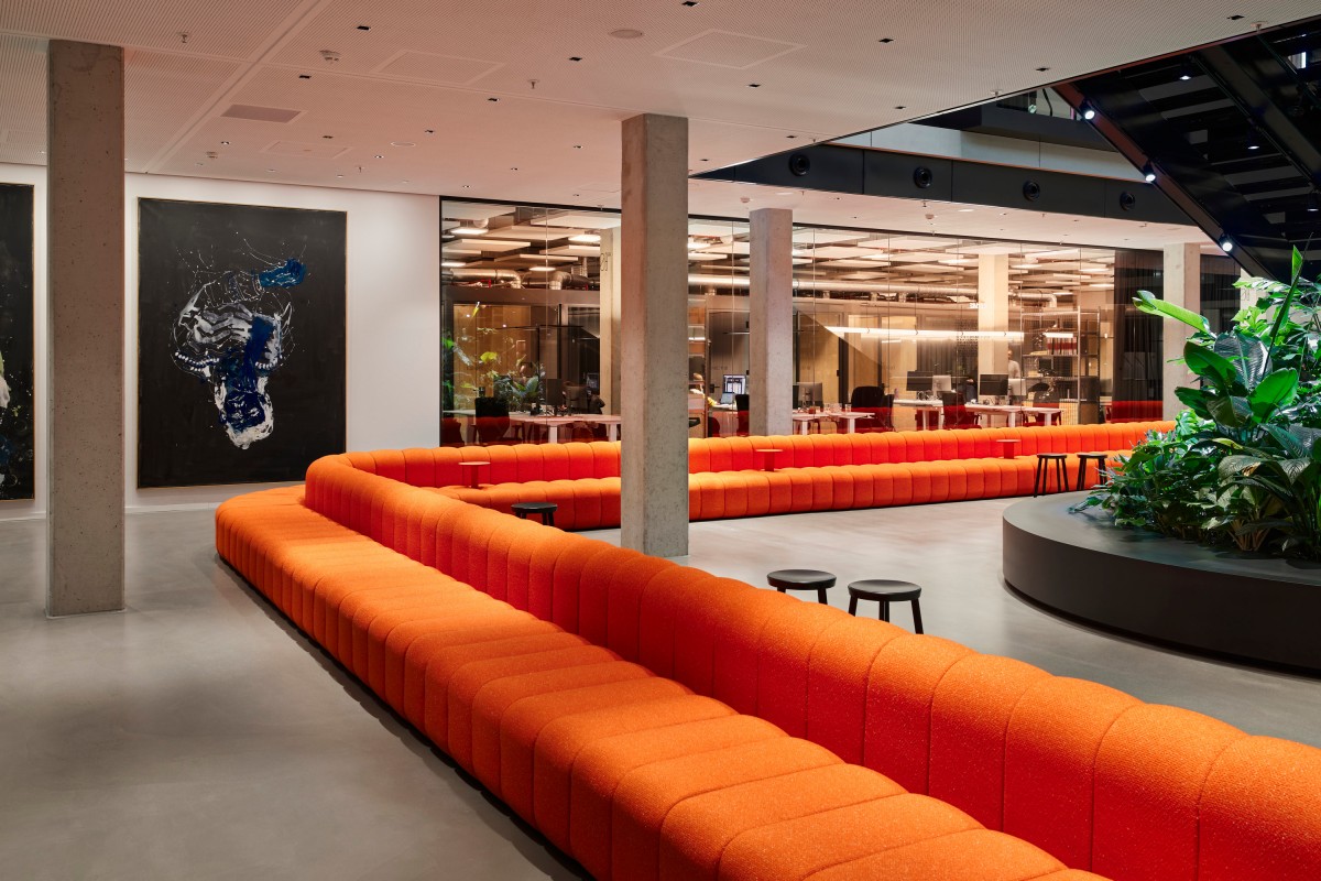The design follows a distinct visual identity developed for Serviceplan based on the idea of a uniform. Like a well-tailored suit that can be styled with statement pieces and colorful accents, the Serviceplan uniform has clear lines and a monochrome color palette of black, white, and gray, creating a coherent whole across all areas and agencies. Coarse industrial materials like steel grating, raw steel, and black-stained wood are used throughout. Serviceplan’s ethos of communication and integration is expressed through unique, oversized furniture pieces – there is room for 100 people on a 30-meter-long sofa upholstered in bold, coral Raf Simons fabric, and space for 80 employees at a single wooden table in the canteen. The monochrome backdrop and simple furniture of the Serviceplan uniform allow colorful and oversized statement pieces to pop.