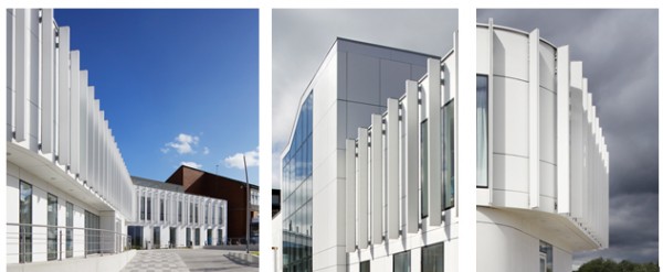 Over 1,000 square metres of Corian® in Glacier White, in a 12mm thickness has been applied for an open-jointed façade featuring engraved panels and shading fins. Supplied by CDUK, the facade was created by Unique Fabrications.