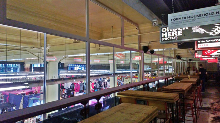 Originally, the MEATmarket platform had no windows, just PVC strip curtains and netting, which was unattractive and did little to filter out the noise from the busy market below. Working in conjunction with refurbishment specialist PJ Harte, Selectaglaze was briefed to design, manufacture and install a glazed screen incorporating fixed and horizontally sliding units to seal off the burger kitchen from the Market and improve both the acoustics and the environment.