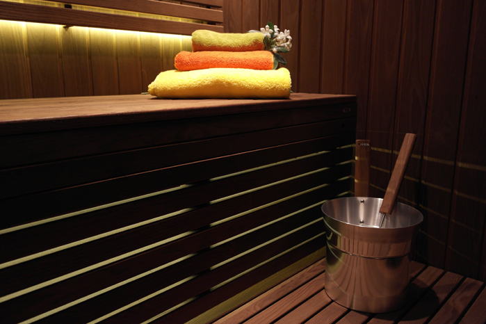 A state of the art touchscreen control panel ensures the perfect bathing temperature at all times and the room was finished with a range of Dark accessories to complement the dark timbre of the heat treated wood.