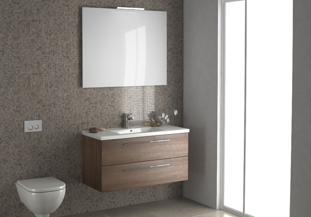 Fusion Seville Furniture in Pacific Walnut. 1000 Unit – 2 Drawer unit with basin, wall-mounted. 990 x 500 x 445mm. Mirror – with single light, 1000 x 800).