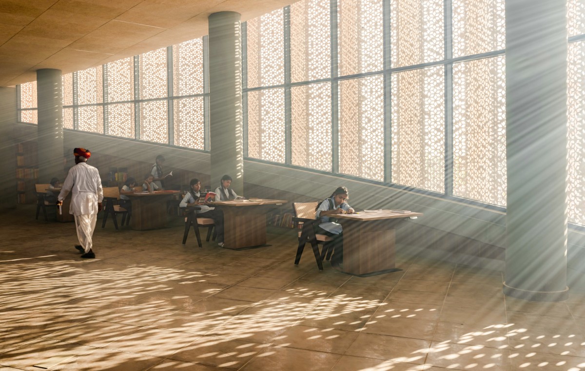The ovoid library is sheathed in natural sandstone screens derived from traditional architecture in Rajasthan, with the stone being sourced from the immediate surrounding area.