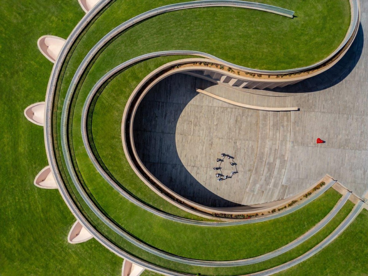 Beneath the garden, at the lower eastern side, there is a small museum with a children’s digital library on the higher western side. The southern side is enveloped in a grass covered earth berm to mitigate heat gain in response to the desert climate, where temperatures of 35 to 40°C are common for 8 months annually. The building forms an open courtyard with an amphitheatre to provide a space for music performances, talks, and social interaction.