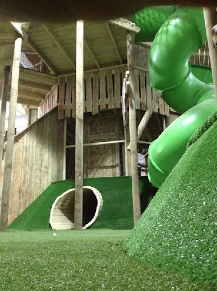 The Monkey Play Barn is a fantastic new weather-proof haven for parents and their children, the giant play barn will allow little ones to let off steam in an inspiring and safe environment. Inspired by the climbing ability of real monkeys, the play area includes wooden climbing frames and towers, slides and swings, completed with Playrite surfaces underfoot. The barn has been transformed from the usual play gym you might find, into one that is unique in its mirroring of nature using Playrite’s Nearlygrass and Matchwinner the barn has been given an authentic outdoor feel. Nearlygrass is a strong resilient surface, able to handle the most rigorous of children. Not only does it give the appearance of grass but it has a lovely feel underfoot and offers comfort as well as longevity of use. Our Matchwinner surface is usually more associated with sports facilities but on this occasion it again offers the durability and resilience required.