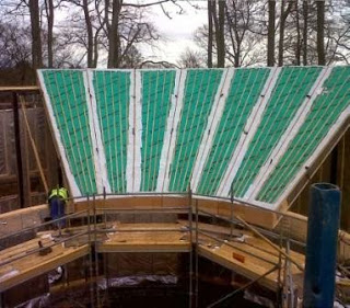 The architectural design is particulary distinctive being of circular form with split dual sloping roof. The construction form is based on high thermal efficiency timber frame using Scotframes Val-U-Therm system. The roof was particularly difficult with its geometry, almost like slating the inside of a bowl. 2.5 tonnes of Burlington Best random width slate has been laid on the roof.