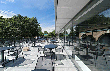 Steel-framed, cantilevered stairs with glass balustrades for an open feel lead up from both sides of the ground floor to the extensive mezzanine seating area and the terrace beyond, but barely impinge on the stunning, spacious and transparent feel of the building’s interior. The interior of the front extension features a variety of loose and fixed tables and seating, from oak tables with bar-stool height chairs in vibrant orange to white smaller tables with black and white seating, plus curved ‘S’ shape modular seating, offering ease of access and informal arrangement for families with small children or pushchairs. A smaller area to the left of the ground floor, within the wing section, can be segregated off as needed for meetings or private events, via large sliding partition screens. Flooring is a Solus Ceramic grey ceramic floor tile at ground level with Forbo linoleum for the mezzanine.