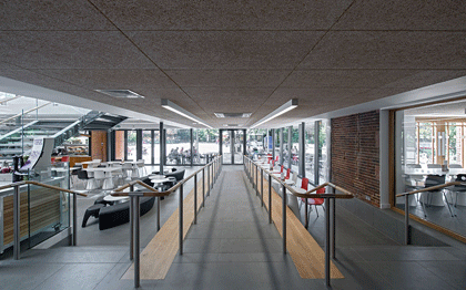 Externally, soldier course block paving announces the new building and separates it off from the herringbone paving of the external square (Barclay Court). Outside seating and tables are part-canopied by the building’s overhang (in quartz-coloured Parklex) for maximum solar shading. South-facing, full-height curtain wall glazing to the front of the extension is punctured by six 2.5m-tall doors. At the top of the doors, a feature grille in anodised, matt aluminium in silvery grey takes the eye away from the plasterboard of the ceiling above. The grille is also featured along the edge of the mezzanine floor plate as a means of minimising its visual bulk.