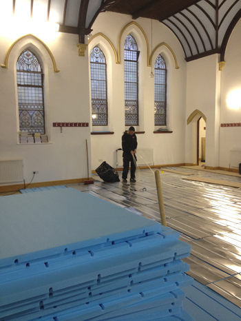 A 120-year old former Methodist Church, Shipley Educational Mosque has been undergoing refurbishment for the past five years, and the central heating upgrade was part of the final phase of the renovation. Although the mosque was previously heated by radiators, the subfloor, which is constructed from suspended timber was very cold underfoot. The new under floor heating plus Styrofoam insulation will help create a more energy efficient, comfortable space for the hundreds of visitors to the mosque each week.