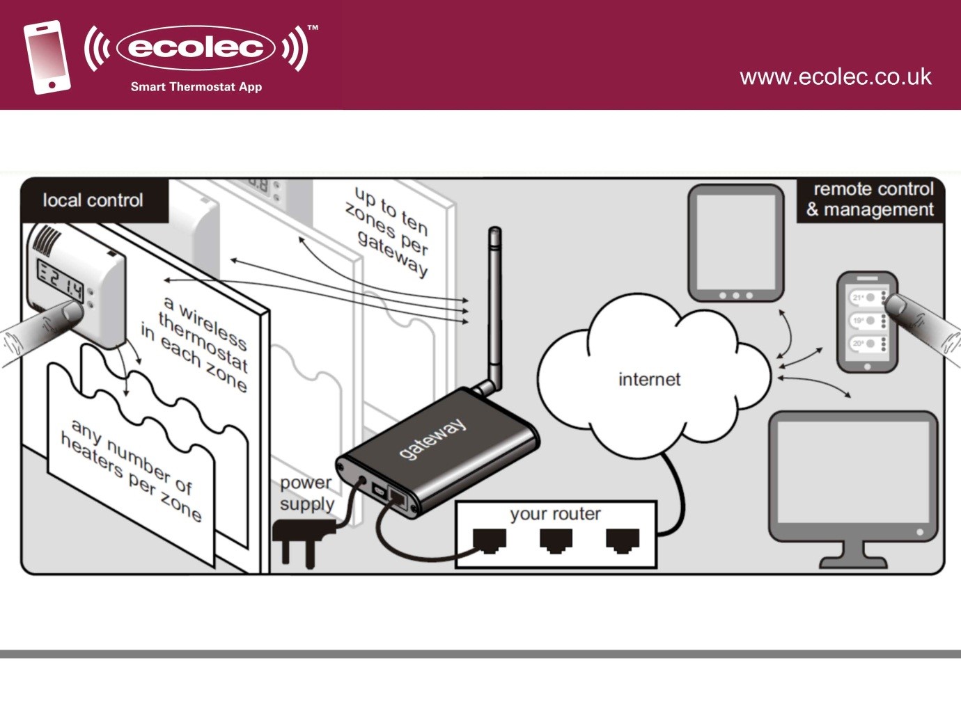 The Ecolec Multiple Zone Gateway is connected via a network cable to a home or office internet router. Programming and control is then available using a PC, tablet, or mobile device with a PC app, browser or mobile app via the internet. The signals between the Gateway, thermostats and heaters are all wireless. Wireless signals between the gateway and each zone’s thermostats and radiators communicate at 433 MHz