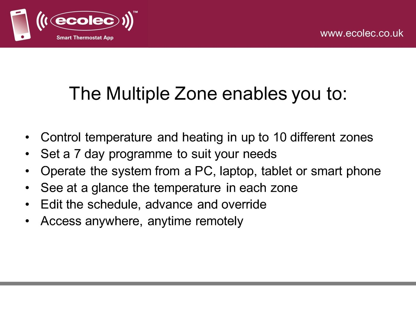 You simply need to log in to a home or office Ecolec heating system via the internet to check the air temperature in any zone or room to make the program changes necessary. This system offers unique levels of flexibility for controlling a heating system remotely.
