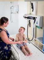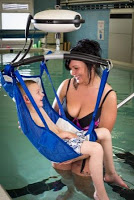 A hand-held remote control device controls lifting and lowering, while carers at the school can assist with movement around the room.