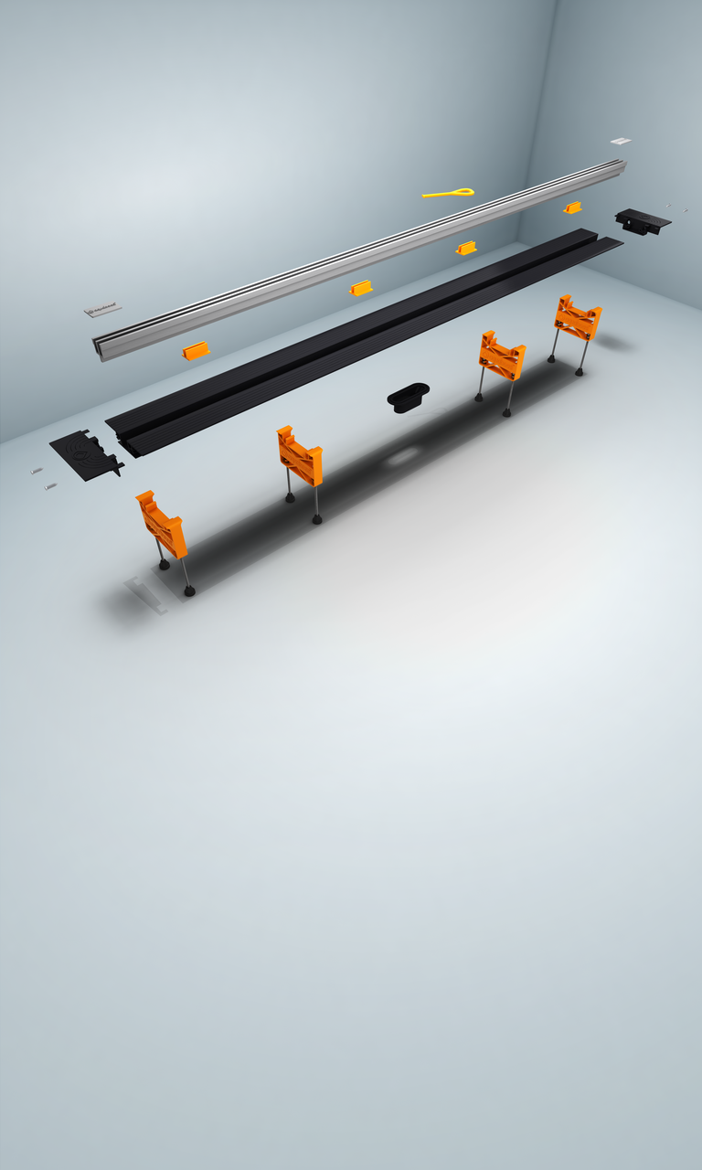 When you order the product it is delivered to you in a cylinder style carton which contains all the required fittings, an installation guide and 2 ABS channel bases which allow the installer to sync the system with varying floor heights and waterproofing details.
