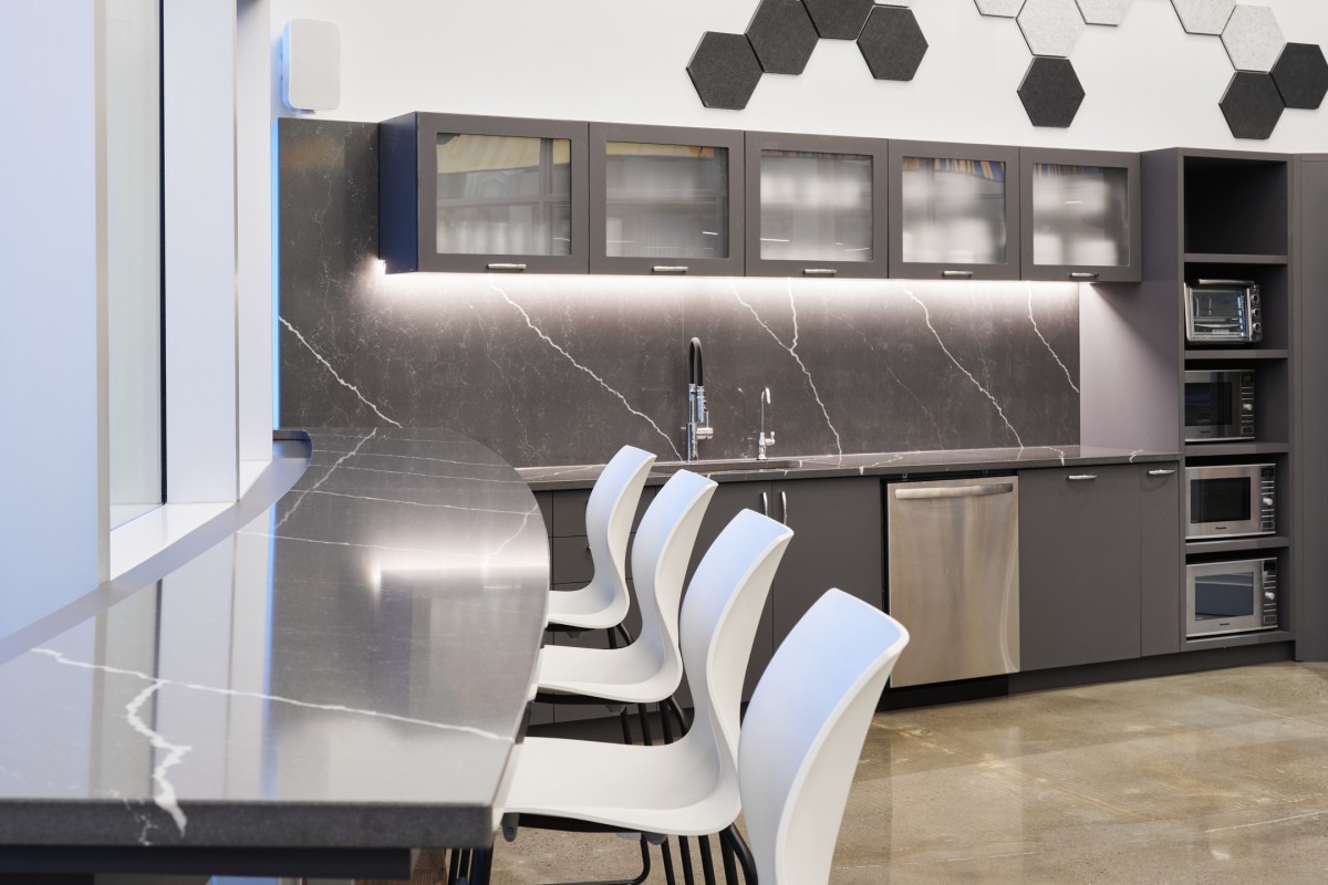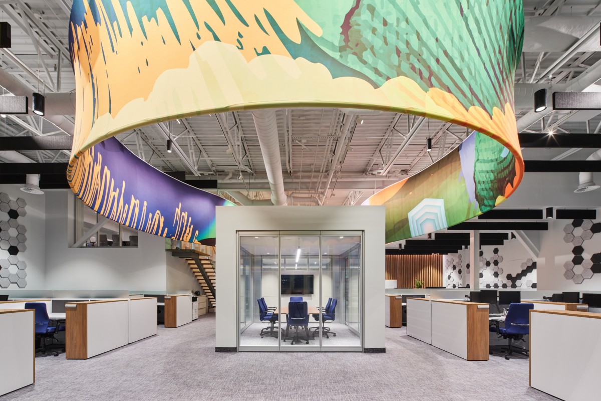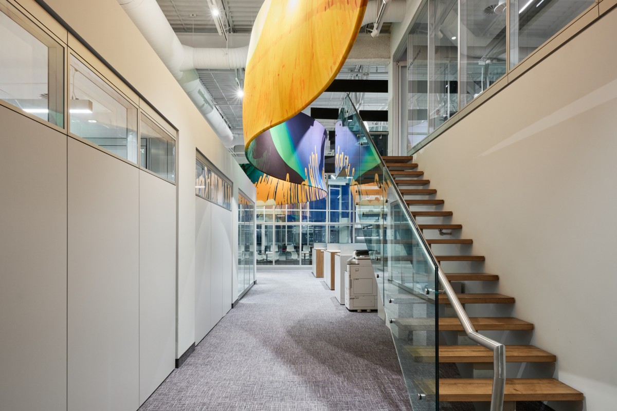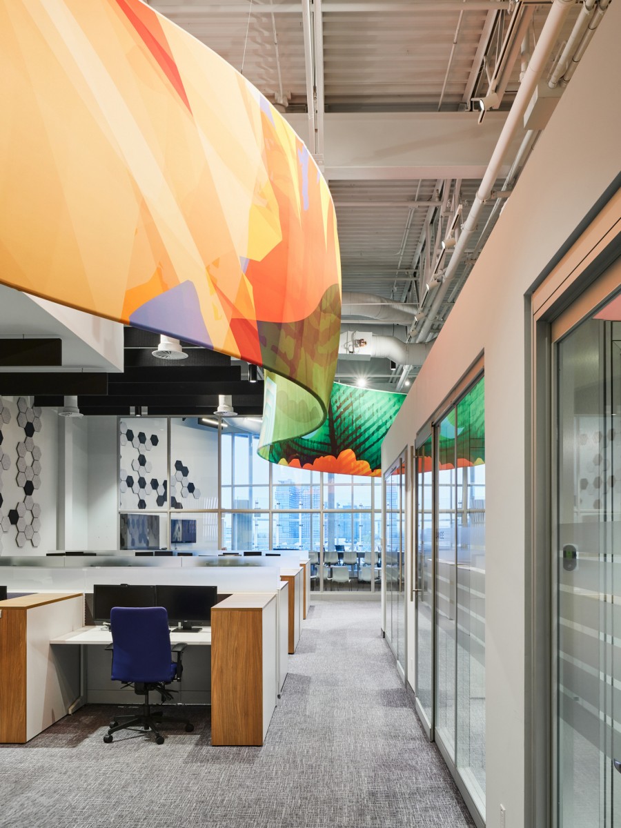 Within that context, the UNIVESTA office sits atop a building housing an art performance centre. While the space is characterized by its high ceilings and views of the nearby Montreal skyline, the design team endeavored to reduce its internal vastness to a more intimate human scale. Key to that process, INDESIGN / Conrath architecte designed a central nucleus comprised of 50 workstations and a series of small meeting rooms. As a piece de resistance, the team introduced a vibrant 2m x 45m suspended graphic installation to harmoniously blend interior and exterior views, while creating a captivating near-far duality.
